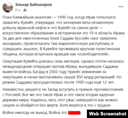 "Известия" журналисты Эльнар Байназаров хәзерге вакыйгаларга охшаш аналогия эзли. Байназаров сугышка каршы журналистлар мөрәҗәгатен дә имзалады. Постта кызыл төс белән сүгенү сүзе яшерелде.